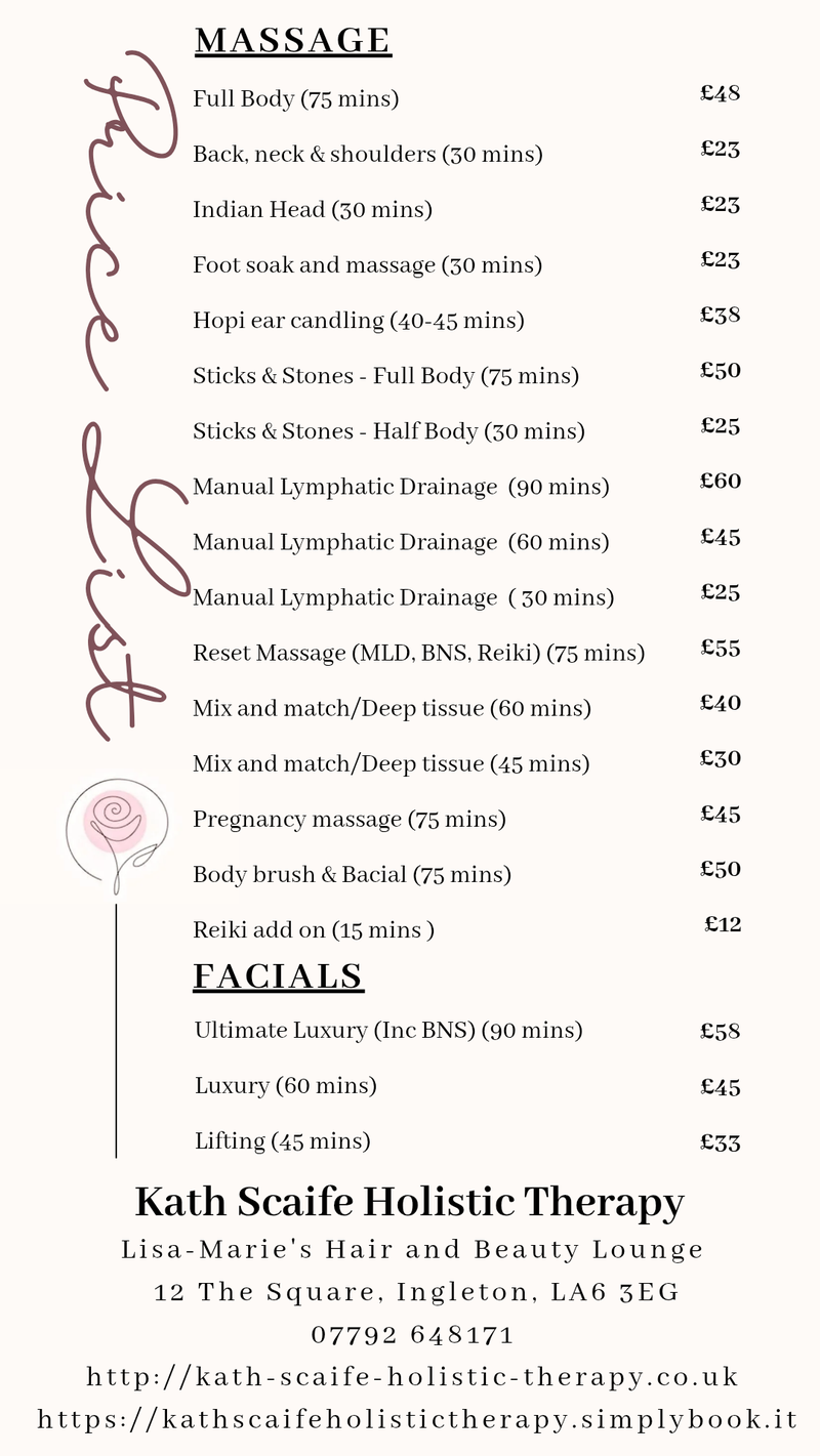 You can find Kath at Lisa-Marie’s Hair and Beauty Lounge in Ingleton on Monday, Wednesday and Thursday. She also works from her home therapy room in High Bentham on Tuesdays and Fridays.